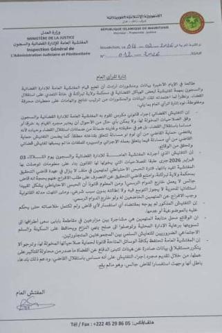 طالعنا في الإيام الأخيرة بيانات ومنشورات أرادت أن تضع قيام المفتشية العامة للإدارة القضائية والسجون بمهمة تفتيشية لبعض الهياكل القضائية في محكمة ولاية لبراكنة في خانة التعدي على استقلال القضاء. ونظراً لما اعتمدته تلك البيانات والمنشورات من ترتيب نتائج واتهامات على معطيات محرفة ومغلوطة، نود إنارة الرأي العام بما يلي: