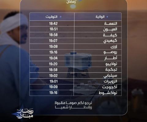 وهذه أوقات الإفطار في عواصم ولايات موريتانيا بالنسبة لليوم الـ23 من شهر رمضان 1447 ه.