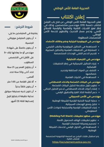 وقالت الشرطة في بيان إن الاكتتاب يشمل مهندس في لبيولوجيا الجزئية وعلم وظائف الأعضاء، وذلك للمساهمة في التحقيقيات العملية والطب الشرعي والتحاليل المخبرية.