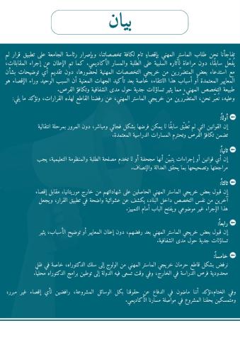 وعليه، نُعبّر نحن، المتضرّرين من خريجي الماستر المهني، عن رفضنا القاطع لهذه القرارات، ونؤكد ما يلي: